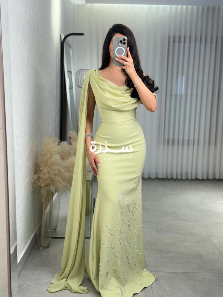 فستان ليموني ناعم بقصة كلوش ضيّقة على الجسم، يتميز بكتف واحد مع كاب منسدل يضيف فخامة راقية. تطريز خفيف بأسفل الفستان يعزز أناقته بهدوء.
