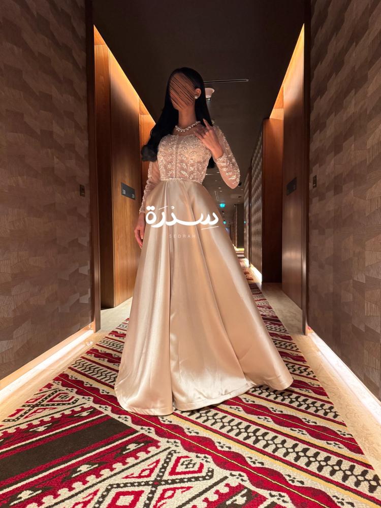 الفستان بلون أوف وايت لامع، يتميز بقصة راقية وملكية. الجزء العلوي من الدانتيل المطرّز بتفاصيل فخمة وأكمام طويلة شفافة، بينما الجزء السفلي مصنوع من قماش ساتان ناعم واسع ومنسدل يعطي إطلالة أنثوية فاخرة