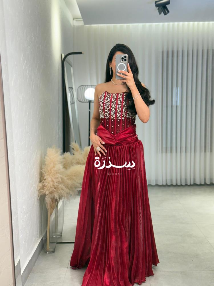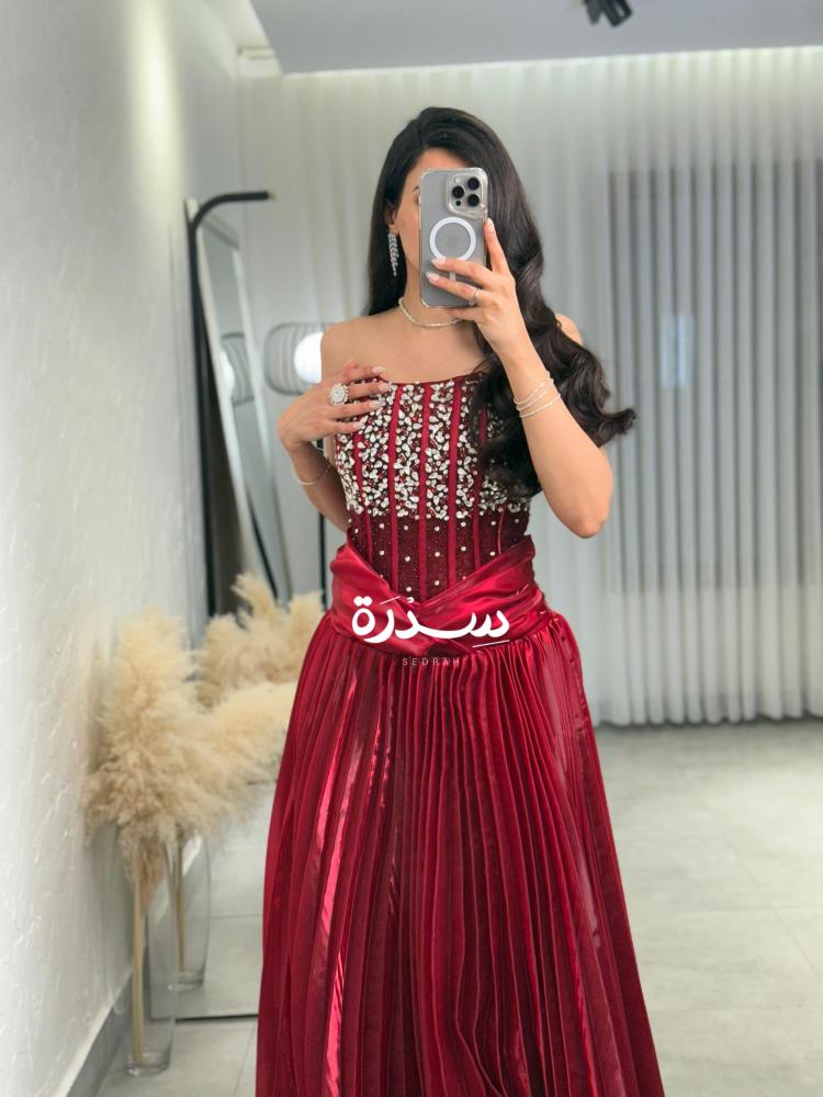 فستان كب عنّابي بتفاصيل مطرزة براقة على الصدر، وتنورة بليسيه لامعة تضيف فخامة وحركة أنثوية ناعمة. تصميم جريء يدمج بين الرقي واللمعة الملفتة.