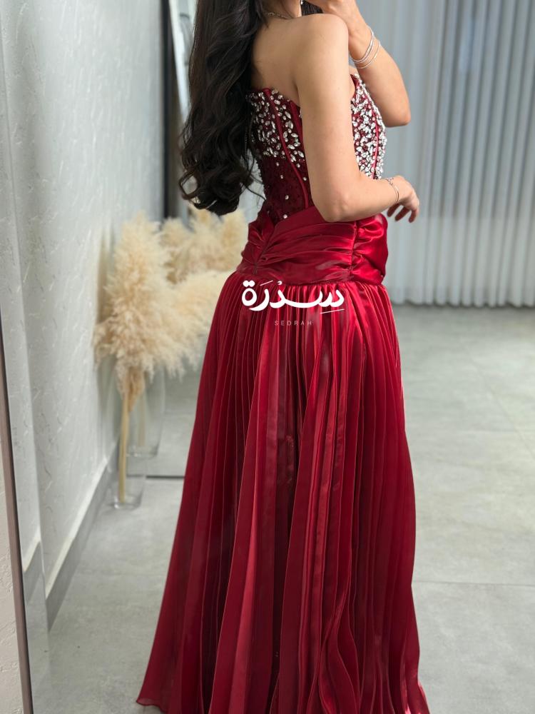 فستان احمر بكورسيه مزين بفصوص