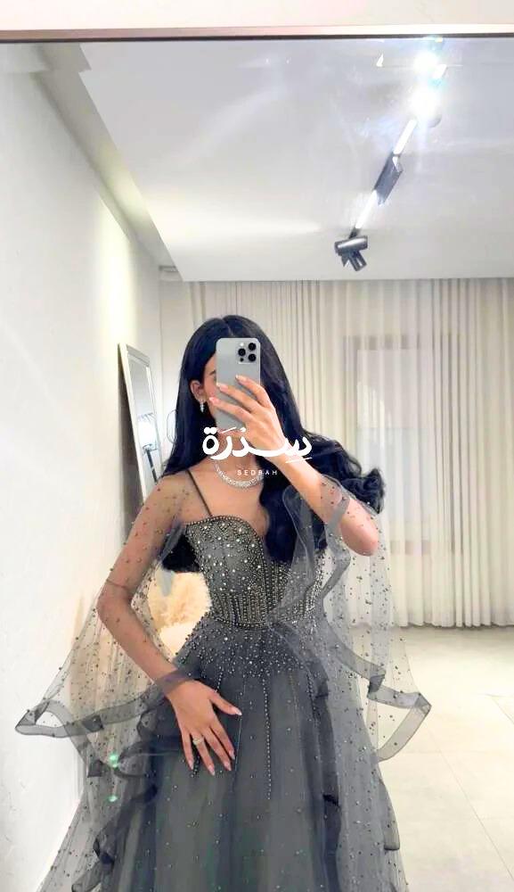 فستان رمادي منفوش بطبقات تول ناعمة وأكمام شفافة، مزين بتطريز فاخر على الصدر. تصميم ساحر بطابع خيالي يخطف الأنظار بهدوئه وفخامته.