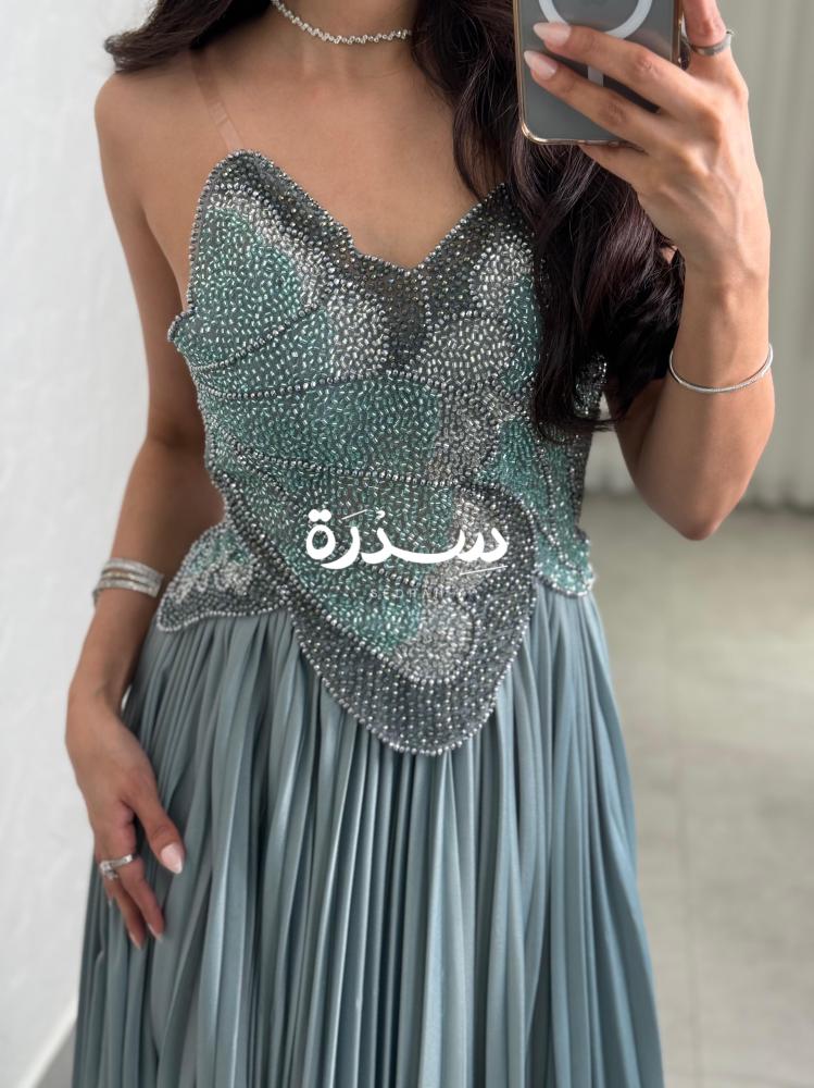 فستان فضي بتصميم ملوكي، الصدر مطرّز بتفاصيل لامعة أنيقة، والتنورة بليسيه واسعة تنسدل بانسيابية فخمة. تصميم ساحر يدمج بين الأنوثة والرقي في كل حركة.