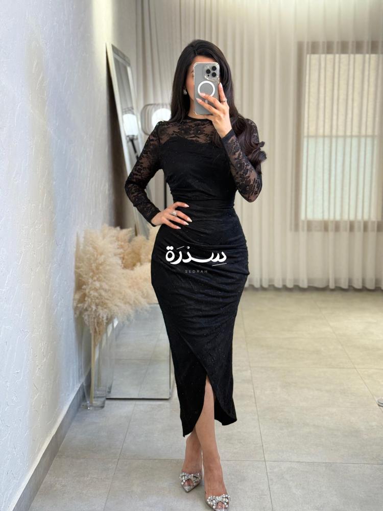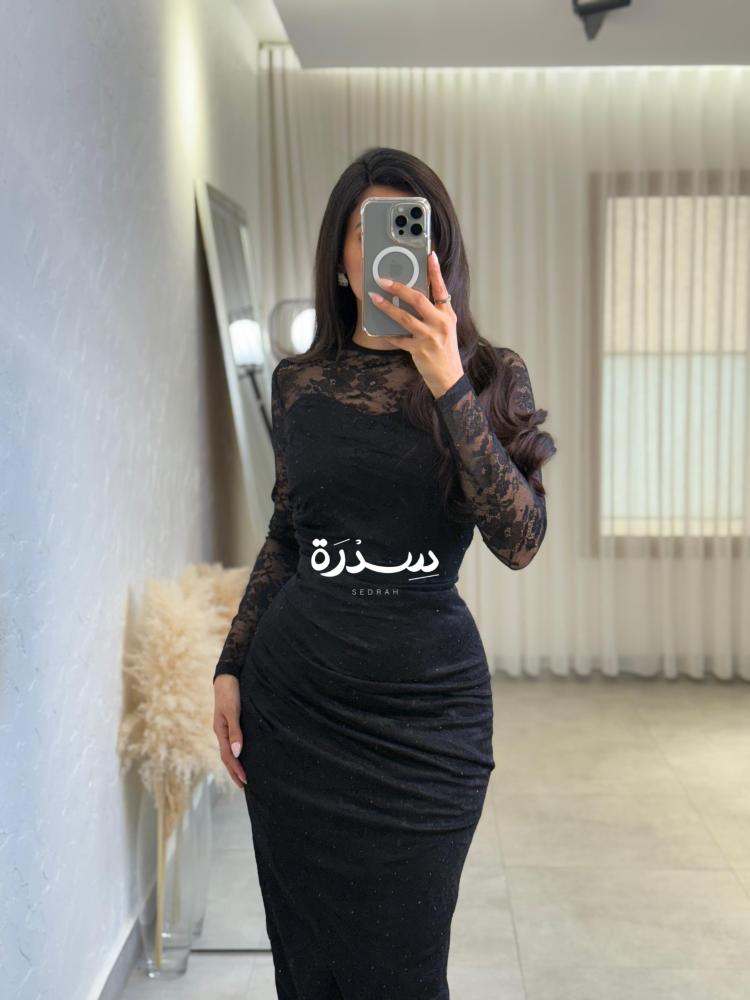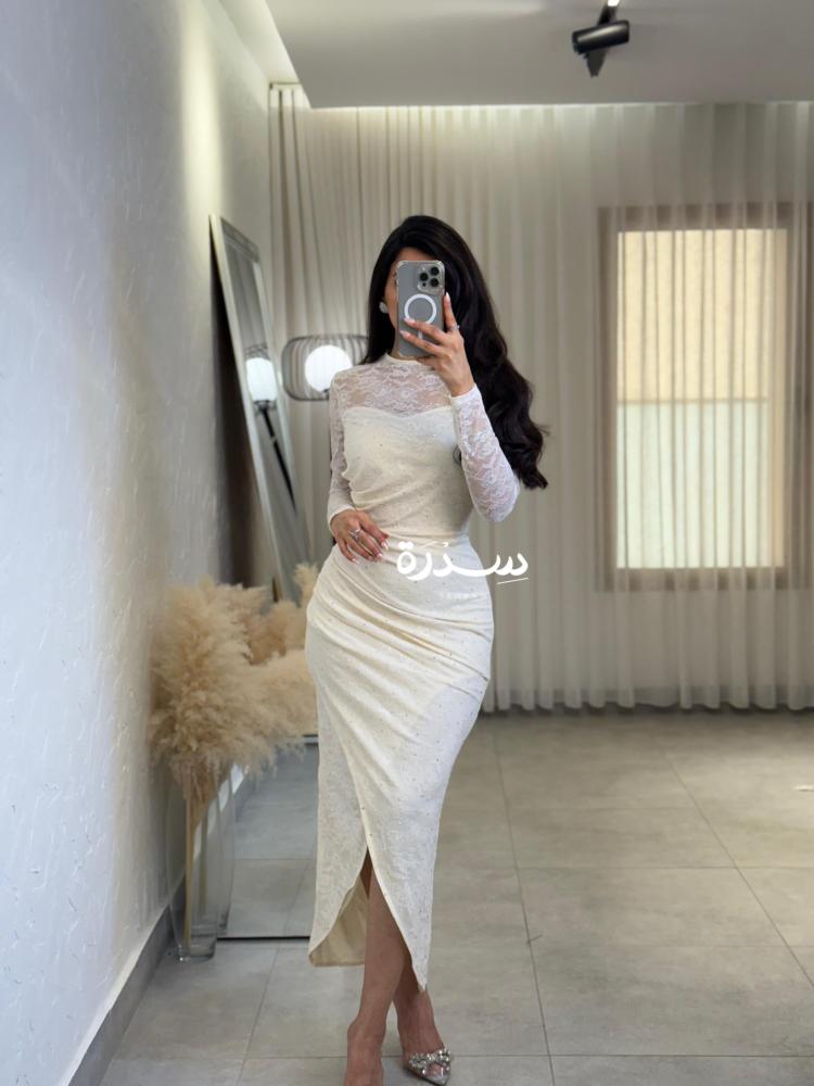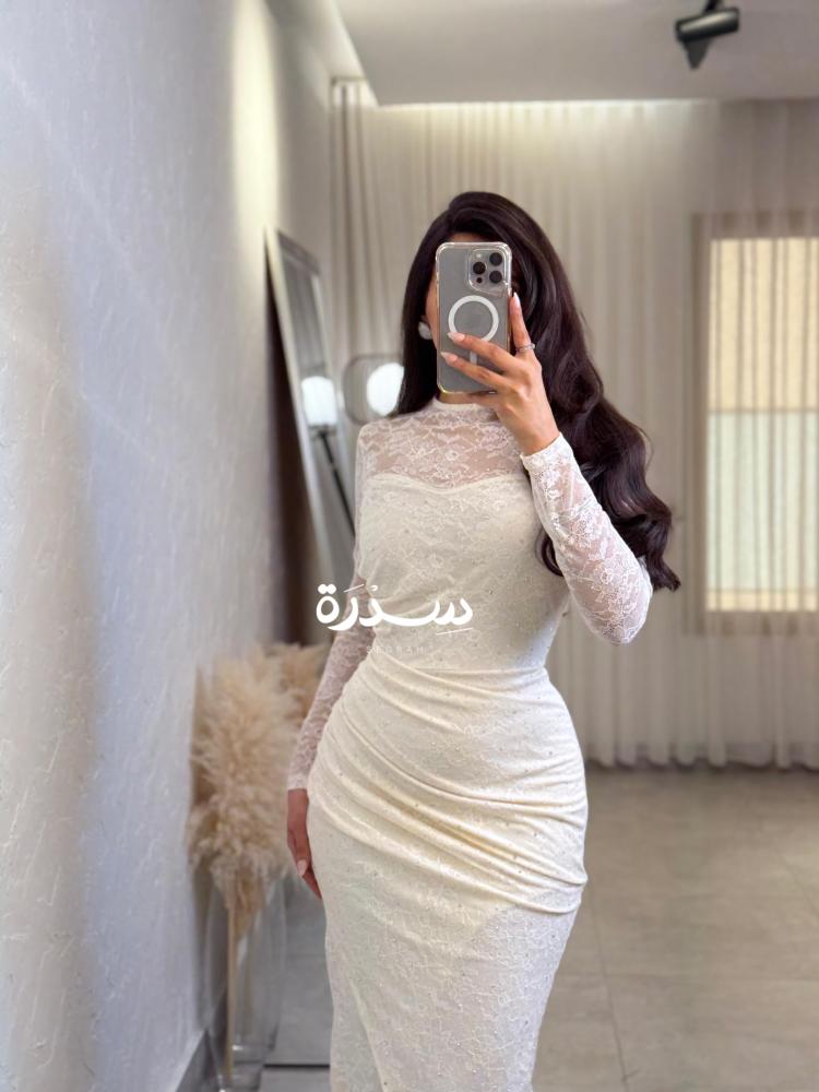 الفستان أبيض أنيق بقصة ضيقة تبرز القوام، مصنوع من دانتيل ناعم مع أكمام طويلة شفافة. التصميم يتميز بياقة عالية وشق أمامي خفيف عند الأسفل يضيف لمسة أنثوية وجاذبية