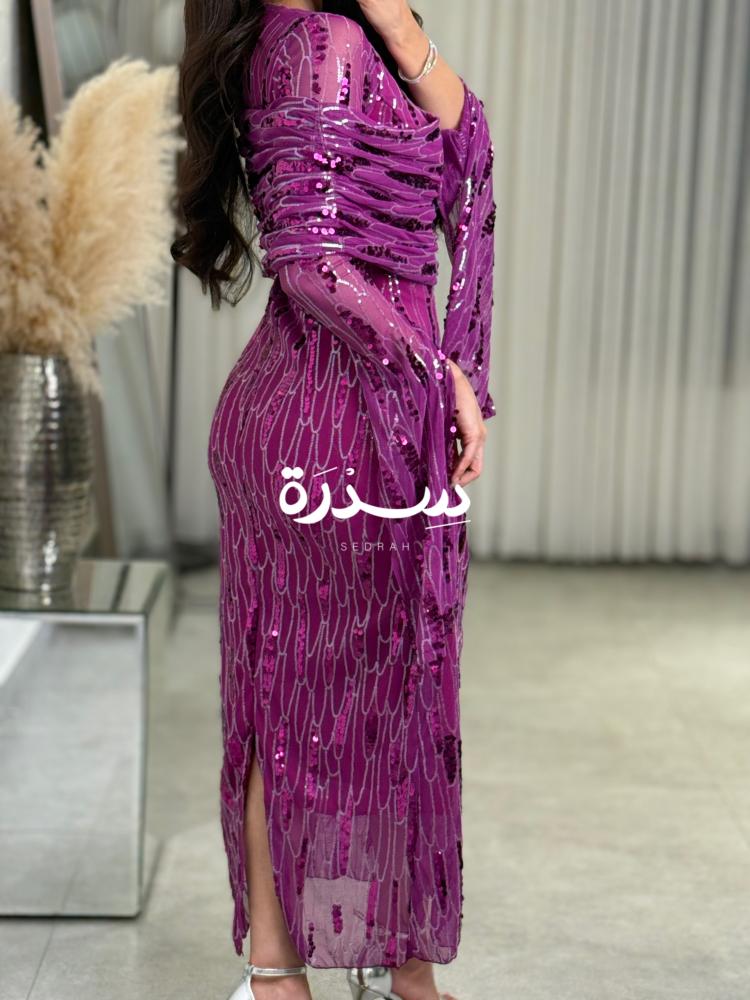 فستان فوشي مطرز قصة فالكتف