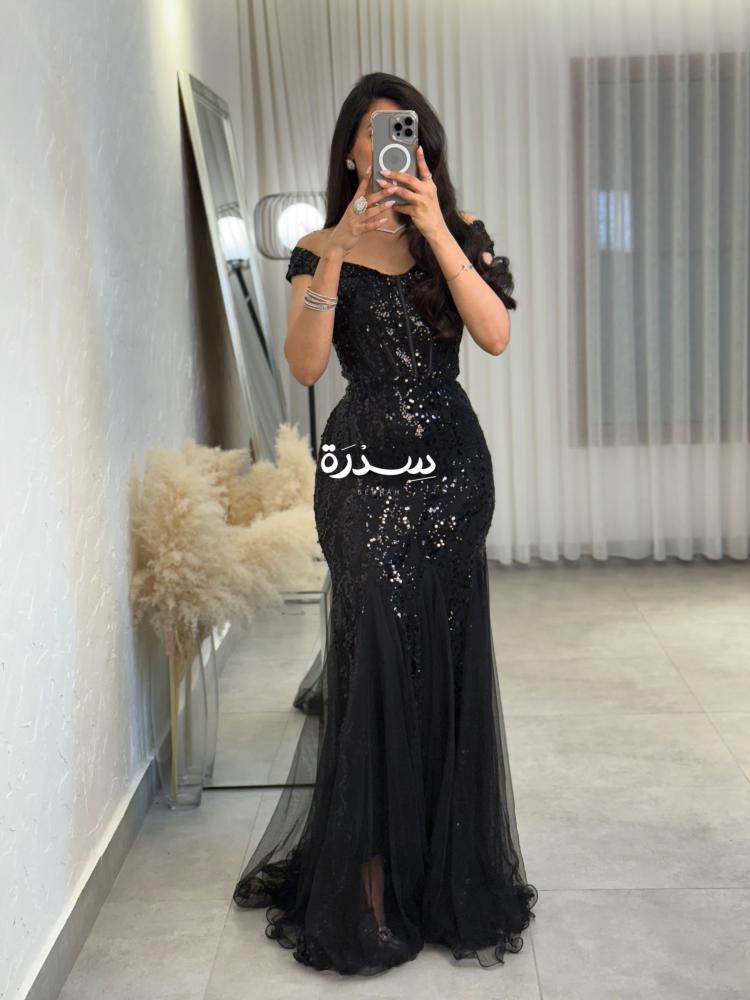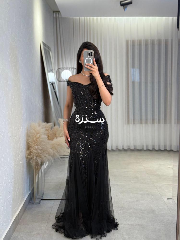 الفستان أسود طويل بتصميم أوف شولدر أنثوي، مطرز بالكامل بترتر لامع يعطي لمسة فخامة. القصة ضيقة حتى الركبة مع تنورة شفافة من التول تضيف حركة وانسيابية أنيقة