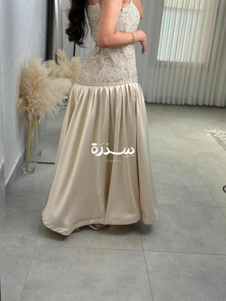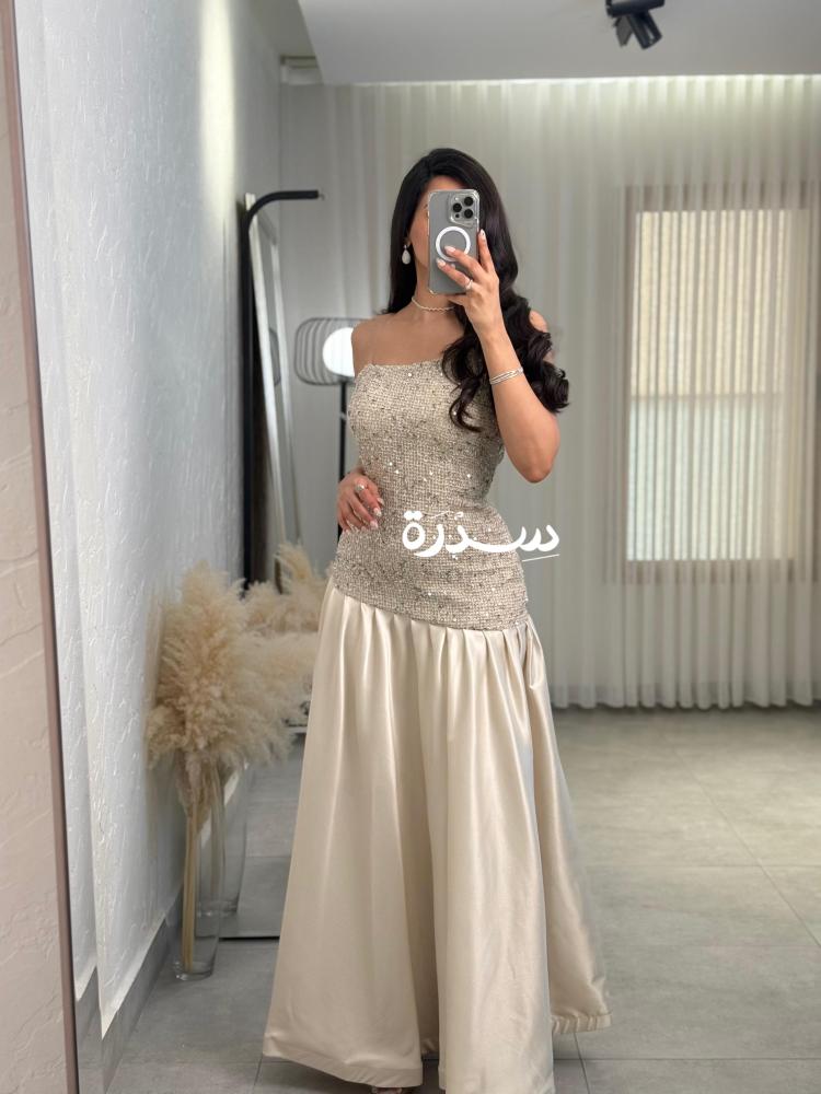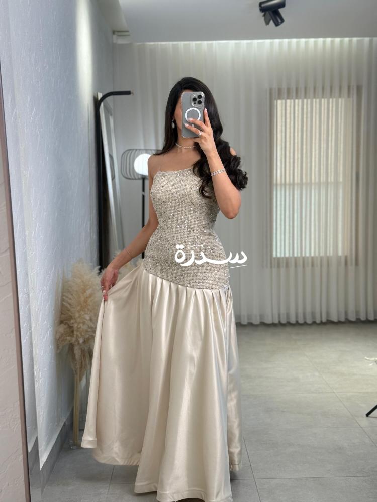 فستان أوف وايت أنيق بصدرية مطرّزة بلمعة ناعمة وقصة مائلة من الخصر، تنسدل منها تنورة ساتان واسعة. تصميم أنثوي راقٍ يجمع بين الفخامة والنعومة في آن واحد